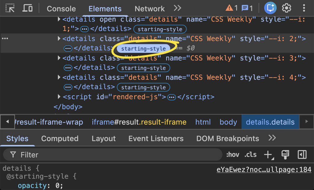 How to debug @starting-style at-rule in Chrome DevToolsCSS Weekly Learn how to debug the Starting Style at-rule in Chrome DevTools. Continue on CSS Weekly » Post navigation « AI Development Skeptic? Start Here.Chrome DevTools Tips: Target Recent Elements in Console »