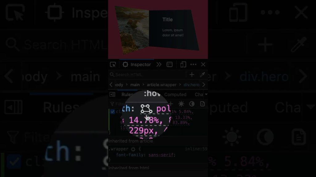 Use Firefox DevTools when working with CSS clip-pathCSS Weekly A guide to using CSS Clip-Path Editor, available in Firefox DevTools. Continue on CSS Weekly » Post navigation « 6 Mind-Blowing CSS Only GamesFrontend News #3: State of CSS, Color Fonts »
